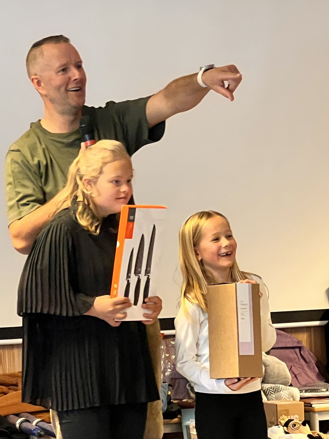 Pappa Jan Robertsen deler ut gevinster sammen med Olivia og ei av hennes venninner.